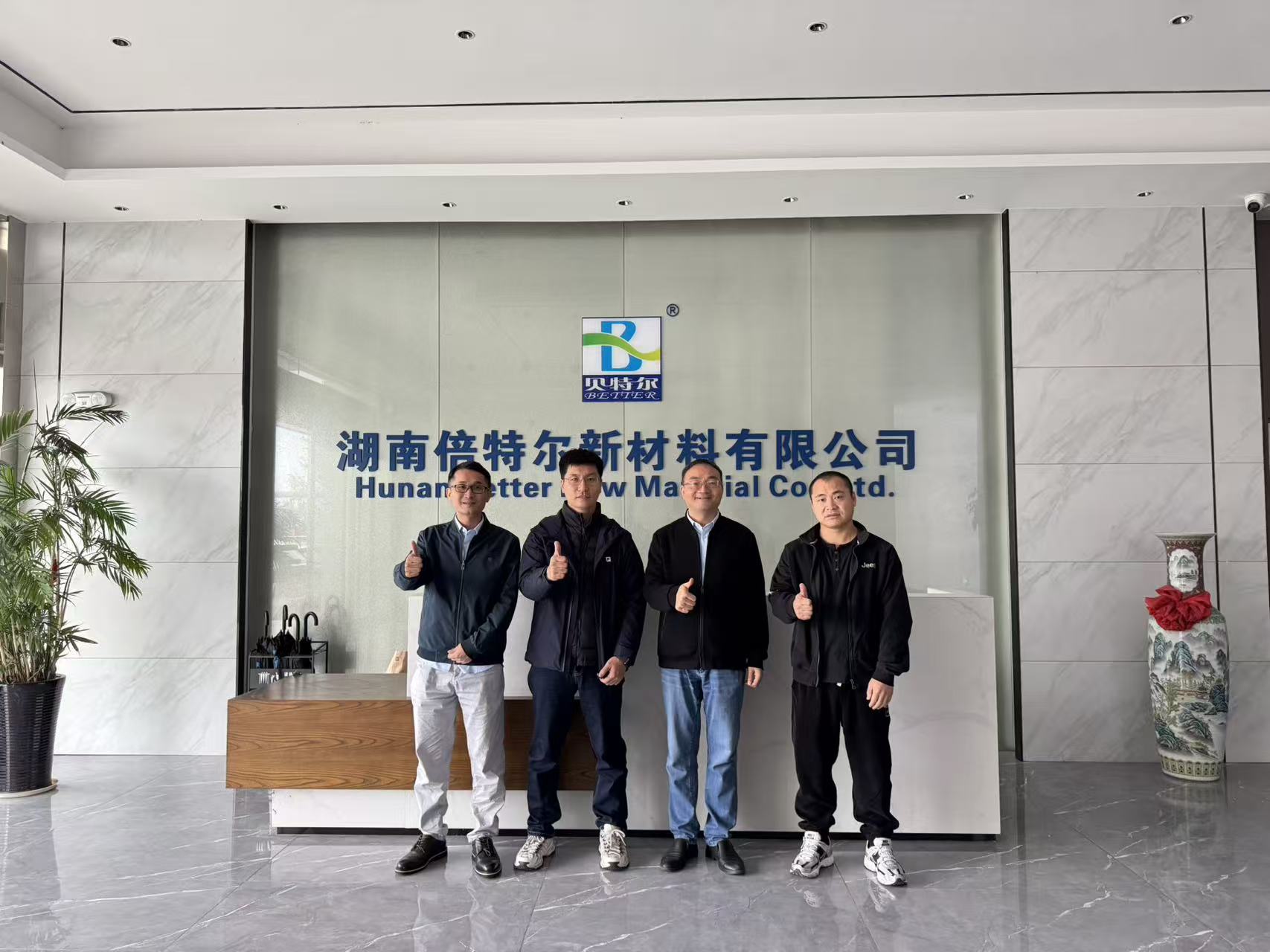 又讯:2025年10月21日,广东彩霸新材料科技有限公司总经理蔡亚彬、广州市中翰创能新材料科技有限公司总经理陈有发一行到访湖南倍特尔新材料有限公司,开启了一场聚焦行业前沿技术与产学研合作的深度交流。倍特尔总经理陈君求热情接待并全程陪同参观商谈。